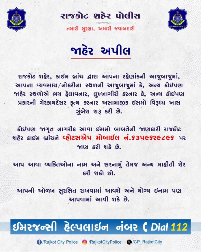 આવા કોઈપણ શંકાસ્પદ વ્યક્તિ કે ગેરકાયદેસર પ્રવૃત્તિ અંગેની જાણકારી નાગરિકો ક્રાઈમ બ્રાંચના વ્હોટ્સએપ નંબર 6359629896 પર મોકલી શકે છે.
