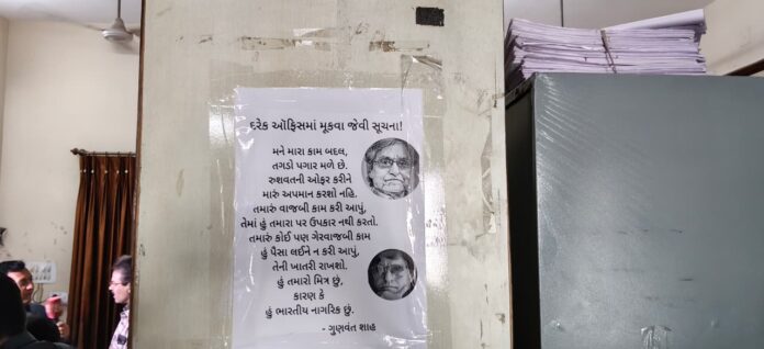 રાજકોટ મહાનગરપાલિકામાં ચાલી રહેલા ભરષ્ટાચારથી કંટાળી એક અધિકારીએ અનોખો વિરોધ નોંધાવ્યો. શહેરના મુખ્ય વિસ્તારોમાં તેમણે પોતાના હાથે જ પોસ્ટર લગાવી જાહેરમાં આચરાતી ગેરરીતી સામે અવાજ ઉઠાવ્યો. પોસ્ટરમાં વિભાગીય કાર્યવાહી, લાંચખોરી અને મંજૂરીઓમાં થતી ગેરરીતીના આક્ષેપો કરાયા હોવાનું જાણવા મળે છે.