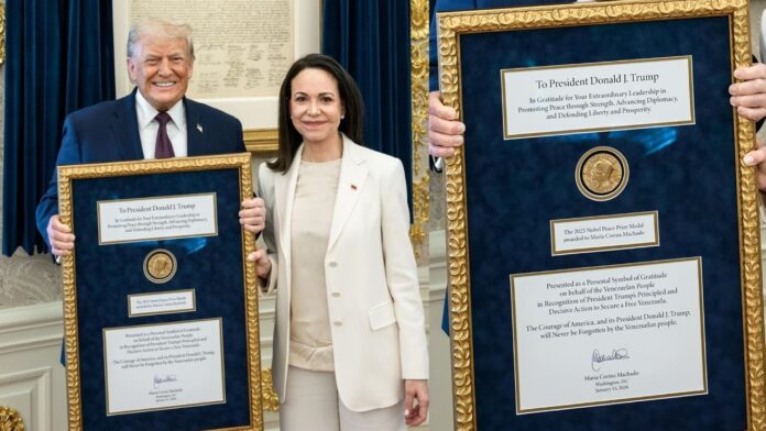 વેનેઝુએલાના વિપક્ષી નેતા મારિયા કોરિના મચાડોએ ગુરુવારે યુએસ રાષ્ટ્રપતિ ડોનાલ્ડ ટ્રમ્પને તેમનો નોબેલ શાંતિ પુરસ્કાર અર્પણ કર્યો. તેમણે વ્હાઇટ હાઉસ ખાતે રાષ્ટ્રપતિ ટ્રમ્પ સાથે મુલાકાત કરી, જ્યાં તેમણે એવોર્ડ અર્પણ કર્યો. તેમણે કહ્યું, “બેસો વર્ષમાં આ પહેલી વાર છે જ્યારે વેનેઝુએલાના લોકો વોશિંગ્ટનના ઉત્તરાધિકારીને મેડલ અર્પણ કરી રહ્યા છે. આ નોબેલ શાંતિ પુરસ્કાર મેડલ છે, જે આપણી સ્વતંત્રતામાં તેમના વિશેષ યોગદાનને માન્યતા આપવા માટે આપવામાં આવે છે.”
